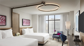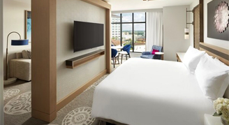 Rest comfortably with a king bed, a modern bathroom with an oversized shower, city views, and hearing-accessible features. Visual fire alarm and notification devices are available, and an outlet within 4' of the phone for TTY (teletypewriter).