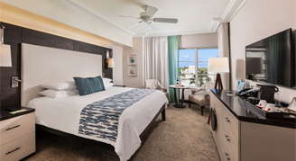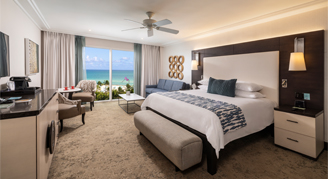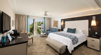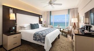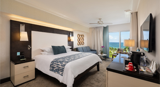 Rooms feature a king-size bed, full-size pull-out sofa bed, and a work/dining table with two armchairs. These oversized oceanfront rooms offer breathtaking views of the ocean, beach and tropical pool area.