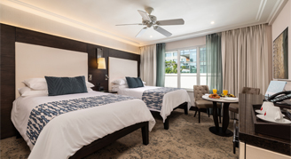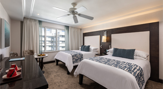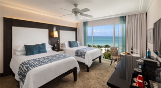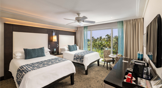 Room features two elevated double beds with Egyptian cotton linens and plush-down pillows that invite guests to unwind amid views of the Atlantic Ocean and The Palms' colorful on-property tropical gardens.