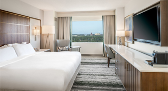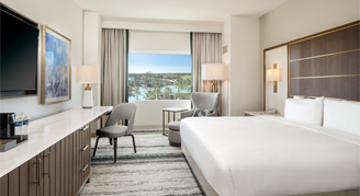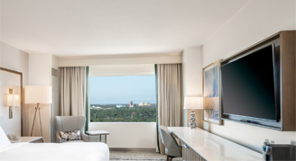Rooms feature views of the resort's pool, golf course and Bonnet Creek Nature Preserve.