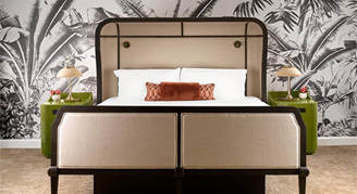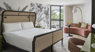 Cool tones, clean lines, and a colorfully modern, naturally textural palette with tropical touches make up this Palm Beach resort room featuring one king bed, custom wood headboards, a tropical black and white wall mural, bold color nightstands and media console, a pink pineapple lamp, arc lamp, 55’’ LCD HD TV, sitting area, and an executive desk. The spa-style bathroom has free-standing metal vanities with white quartz tops, a custom illuminated mirror, white terrazzo tile floors, black porcelain wall tile, and a separate vanity area.