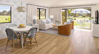 Great for a tropical getaway with family or friends, these West Palm Beach suites feature a stylish living area with a pull-out sofa bed, a dining table, and four chairs.