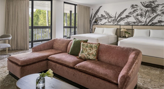 Cool tones, clean lines, and a colorfully modern, naturally textural palette with tropical touches make up this Palm Beach resort room featuring two queen beds, custom wood headboards, a tropical black and white wall mural, bold color nightstands and media console, a pink pineapple lamp, arc lamp, 55’’ LCD HD TV, sitting area, and an executive desk. The spa-style bathroom has free-standing metal vanities with white quartz tops, a custom illuminated mirror, white terrazzo tile floors, black porcelain wall tile, and a separate vanity area.