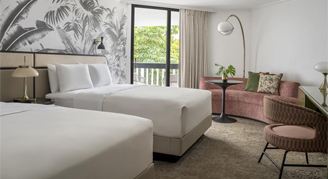 Take in stunning pool or lake views from your private, furnished balcony or terrace, and unwind in a room showcasing cool tones, clean lines, and a colorfully modern and naturally textural palette with tropical touches. These luxury resort rooms feature two queen beds, custom wood headboards, a tropical black and white wall mural, bold color nightstands and media console, a pink pineapple lamp, arc lamp, 55’’ LCD HD TV, sitting area, and an executive desk. The spa-style bathroom has free-standing metal vanities with white quartz tops, custom illuminated mirror, white terrazzo tile floors, black porcelain wall tile, and separate vanity area.