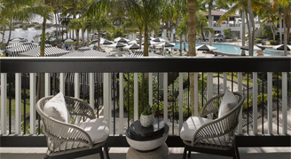 Sit back and relax in the transformed Deluxe Resort View room at PGA National Resort. Take in expansive views of the golf course, spa, or courtyard from your private, furnished balcony or terrace. These Palm Beach deluxe rooms feature one king bed, custom wood headboards, a tropical black and white wall mural, bold color nightstands and media console, a pink pineapple lamp, arc lamp, 55’’ LCD HD TV, sitting area, and an executive desk. The spa-style bathroom has free-standing metal vanities with white quartz tops, a custom illuminated mirror, white terrazzo tile floors, black porcelain wall tile, and a separate vanity area.
