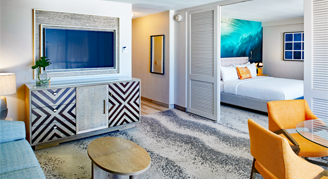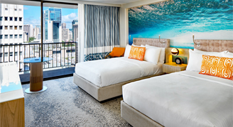 OUTRIGGER Waikiki Beachcomber Hotel brings a new, tech and modern vibe to Waikiki with stylish guest rooms and suites that feature views of the Pacific Ocean, Diamond Head or cityscapes from private lanais. All rooms are nonsmoking and include Keurig coffee and tea kits, 55 inch SMART TVs, Bluetooth clock radios, USB outlets, and wireless streaming via Staycast, powered by Google.