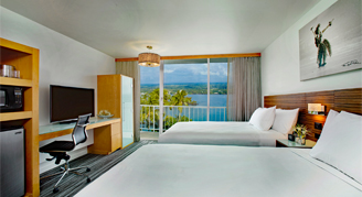 Rooms feature scenic oceanfront views with outdoor seating, and offer a spacious desk with ergonomic desk chair and a stylish bathroom with a bathtub/shower combination. Additional features include complimentary Wi-Fi, a 48-inch HDTV, an alarm clock, hairdryer, microwave, mini-fridge, in-room safe, cordless phone, and a coffeemaker with local coffee flavors.
