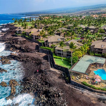The terrace design offers uninterrupted views of the Kona Coast. The central courtyard's cascading stream, tropical flowers and flowing vines create a peaceful garden retreat within the heart of this residential resort. Kailua-Kona town is just a mile away, where deep-sea fishing charters, snorkel tours, shopping and dining are easily available.