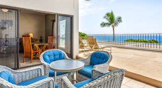 Suites feature a distant and angled ocean view from the lanai. Additional amenities include one separate bedroom and a spacious living area.