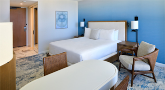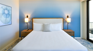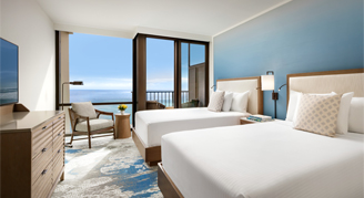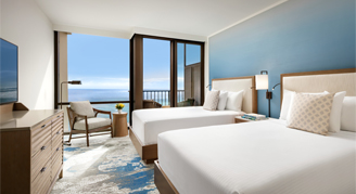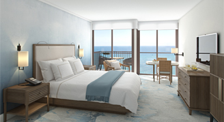 Elegantly appointed guest rooms offer a full balcony with décor and furnishings in variations of white with gray, beige, and blue accents. Bathrooms exude cool and modern elegance with porcelain floors, marble vanity, and a deep soaking tub. Rooms are located on floors 19 - 23 and feature sweeping views of the Pacific Ocean.