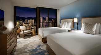 Elegantly appointed guest rooms offer a standing lanai with décor and furnishings in variations of white with gray, beige, and blue accents. Bathrooms exude cool and modern elegance with porcelain floors, marble vanity, and a deep soaking tub. Rooms are located floors 8 - 23 and feature a view of Waikiki.