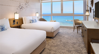 All hotel rooms are oceanfront with floor-to-ceiling windows that feature breathtaking views of the Pacific Ocean and Yacht Harbor.