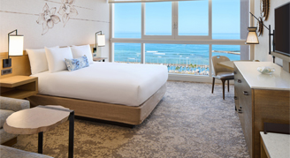 Rooms are located on higher floors and feature expansive oceanfront views of the Pacific Ocean, surf, and sunsets.