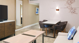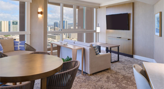 Spacious suites feature varied views of the ocean from Waikiki Beach to the yacht harbor. Suites also include a living room with a dining table, large sofa, love-seat and a spacious bathroom.