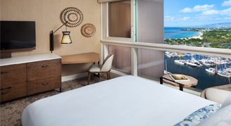 Rooms feature lower oceanfront views overlooking the yachts in the harbor and the Pacific Ocean.