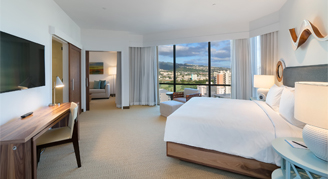 The modern room is ideal for families with views of Waikiki. This is a standard spacious suite with a sleeper sofa and views of Waikiki.