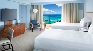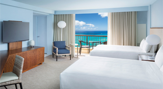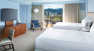 The property has 1,230 rooms, each with a private balcony and highlight the lights and colors of the Hawaiian sea and sky. The furniture is characterized by clean lines with subtle nods to Hawaiian culture. The spacious bathroom offers exclusive amenities from Na Ho'ola Spa and a Toto Washlet.