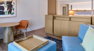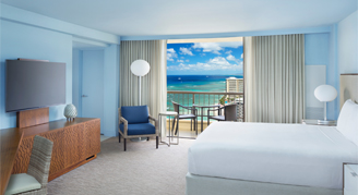 Room features incredible ocean views of Waikiki Beach. Enjoy premium Na Ho'ola Spa bath products, separate lounging area and a full-size sleeper sofa.