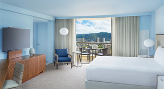 Located in the Ewa Tower, featuring intimate city views, premium Na Ho'ola Spa bath products, separate lounging area and a full-size sleeper sofa.