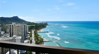 Rooms are located on floors 5 through 24 and feature a view of Waikiki and an ocean view from the lanai.