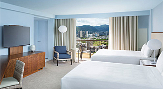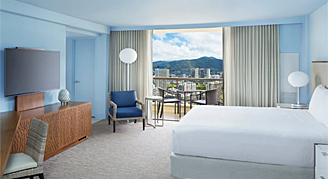 Rooms are located on floors 25 through 40 and feature a view of Waikiki and the Ko'olau Mountains.