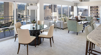 The Luxury Suites are located on the top floors and nestled between the Ala Wai Yacht Club and Duke Kahanamoku Lagoon. Each suite has a full-sized kitchen with new stainless steel appliances, granite countertops, tiled showers, wall-mounted 40-inch flat screen televisions and new air-conditioning systems. Daily housekeeping is available. Kitchen and dishes are cleaned upon checkout.