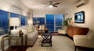 Suites feature a view of the Pacific Ocean and the Waikiki Marina. Additional amenities include a fully equipped kitchen, a designer bathroom and a private balcony.