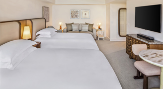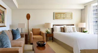 Rooms feature views of the Pacific Ocean from floors 24 to 34 highlight these luxury suites with private lanais. Fully equipped gourmet kitchens feature high-end appliances, including a stove, oven, dishwasher, refrigerator, and a wine cellar cabinet. Additional conveniences include a full-sized washer and dryer and sofa bed in the living room. The bathrooms are outfitted in Italian marble and offer deep soaking tubs and a separate glass-enclosed shower, washlet, and a double vanity. The main bedroom provides a king-sized bed, and the second room provided a queen-sized bed.