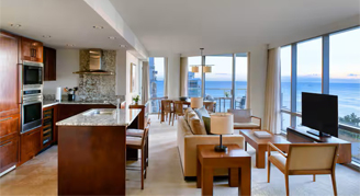 Rooms feature views of the Pacific Ocean and Waikiki Beach. Additional amenities include a separate sitting area, a kitchen including appliances by Wolf and Sub-Zero, fully equipped with an array of cookware and dinnerware, a Sub-Zero wine chiller, an in-suite washer and dryer and an Italian marble five-fixture bath with a deep soaking tub, a separate shower enclosure and double-sink vanities.