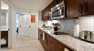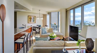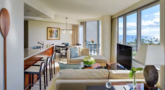 Rooms feature views of the Ko'olau Mountains, the ocean, and skyline of Honolulu. Additional amenities include a kitchenette including appliances by Wolf and Sub-Zero, fully equipped with an array of cookware and dinnerware, and an Italian marble five-fixture bath with a deep soaking tub and double-sink vanities.