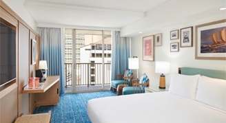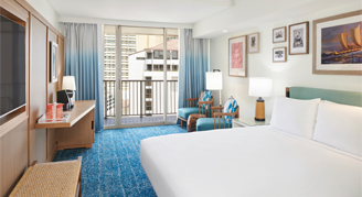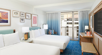 Rooms are located in the Ocean Tower and feature a view of the ocean and Waikiki. Guests also have access to the Voyager 47 Club Lounge, which offers breakfast and early evening pupus (appetizers) with featured wines and local craft beer.