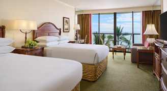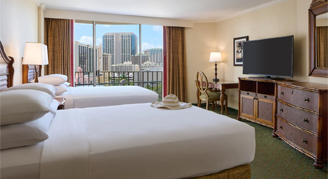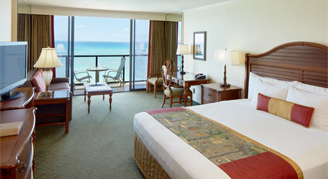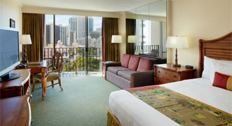Rooms are dressed in contemporary island style featuring Pacific Ocean or downtown Waikiki city views. Club rooms & suites have exclusive access to Voyager 47 Club Lounge with amenities and incredible ocean views. Lounge guests can also take advantage of a dedicated concierge.