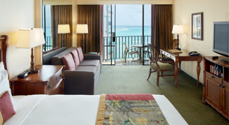 Rooms feature an oceanfront view overlooking Waikiki Beach. Some rooms come with a pull-out sofa.