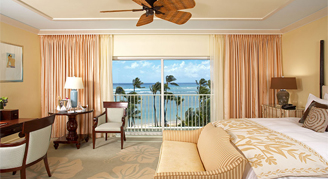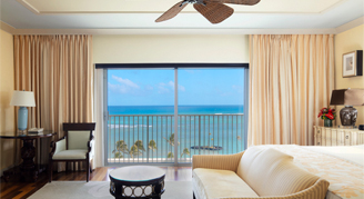 Rooms overlook the Palm Court and Pacific Ocean with views of Diamond Head.