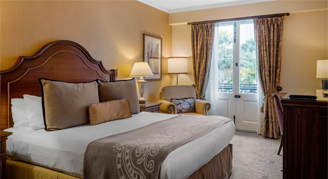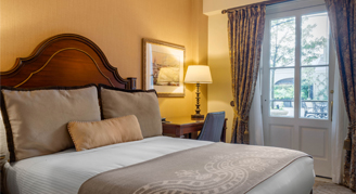 Cozy room that is beautifully appointed with French doors that open onto the hotel's interior courtyard on the second floor.
