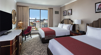 Art Deco inspired rooms are warmly appointed with decorative elements reflective of their connection to the Greatest Generation. Rooms are thoughtfully equipped with modern conveniences, and all baths have walk-in showers and expansive counter tops with lighted make-up mirrors.