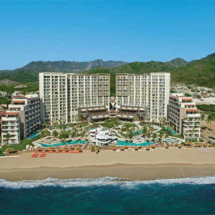 This adults-only, all-inclusive resort is located beachfront on Banderas Bay in the heart of the hotel zone. The resort features 271 spacious suites, including unique swim-out suites with direct access to the pool. Guests of the Preferred Club will also enjoy access to an exclusive lounge serving daily continental breakfast, afternoon hors d’oeuvres, and a selection of desserts and fine liquors, along with upgraded mini-bar service and bath amenities. Guests will enjoy two pools, numerous dining options, bars and lounges, a fitness center, and a 14,000-square-foot spa featuring a hydrotherapy circuit and a comprehensive menu of pampering treatments. Complimentary wireless internet access is offered throughout the resort.