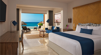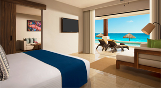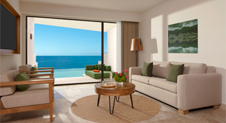 Suites feature an ocean view and access to a semi-private pool. This category formerly known as Preferred Club Junior Suite Swim-Out Beachfront - One King Bed - All-Inclusive.