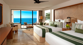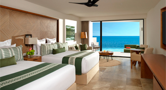 Suites feature an ocean view. Additional amenities include a whirlpool tub on the balcony. This category formerly known as Preferred Club Indigo Junior Suite Oceanfront - Two Queen Beds - All-Inclusive.