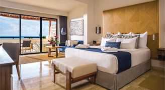 Suites feature an ocean view. Additional amenities include a whirlpool tub on the balcony. This category formerly known as Preferred Club Indigo Junior Suite Oceanfront - One King Bed - All-Inclusive.