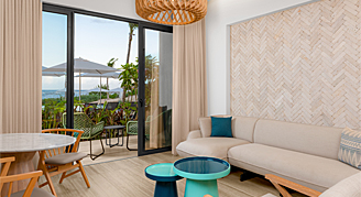 Suites feature a partial-ocean or ocean view. Additional amenities include a separate living and dining area, a soaking tub and an extra half-bath.