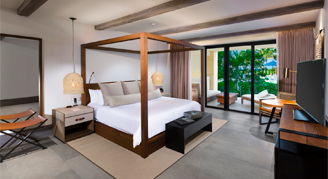Room features a tropical or pool view. Additional amenities include an outdoor hydro tub.