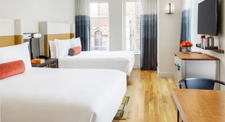 Enjoy city views in this Deluxe Room with two queen-size beds, located on the lower floors. This room boasts a 42-inch HDTV, a mini-bar, Bluetooth Radio, Keurig, and C.O. Bigelow Apothecary bath amenities.