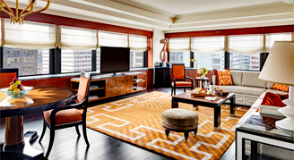 Suites face west, and feature a view of St. Patrick’s Cathedral, Rockefeller Center, and other Manhattan landmarks. Additional amenities include a TV, an iPod dock, a DVD player, a refrigerator, a daily complimentary newspaper, Egyptian cotton sheets and hypo-allergenic bedding.