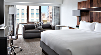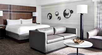 Description: Rooms feature contemporary décor and ultra-plush bedding. Deluxe King rooms come with King bed and a full-size pull-out sofa bed. Features include a mini-fridge, coffee maker and smart TV.
