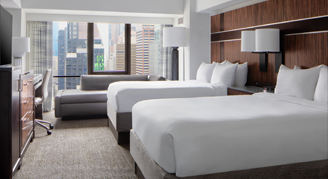 Rooms feature contemporary décor and ultra-plush bedding. Deluxe rooms come with 2 double beds come with a chaise lounge sleeper. Features include a mini-fridge, coffee maker and smart TV.