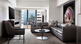 Deluxe One Bedroom Suite are on higher floors. Suites come with one king bed, and a pull-out sofa bed. Additional amenities include Mini fridge, living/sitting area, separate living room, coffee/tea maker, and 55in LED TV .