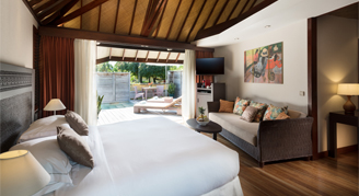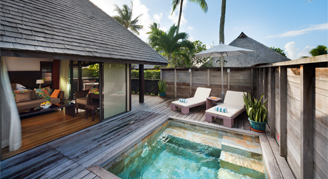 Bungalows are duplex-style and are located in the gardens, farthest from the beach. Additional amenities include a private plunge pool. The complimentary stocked minibar is refilled daily and includes a selection of soft drinks, beers and mineral waters.