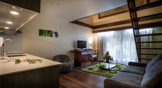 Rooms are located in the gardens toward the rear of the property. Amenities include one bathroom with a shower, a kitchenette and a loft.