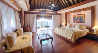 This resort is situated on 21 landscaped acres with 90 rooms, including overwater bungalows, beach bungalows and garden-pool bungalows on a turquoise lagoon and a white-sand beach.